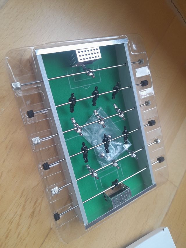 Detalles del productoFutbolin pequeño comprado en el Flying tiger perfecto para decorar la casa,escritorio de trabajo...Es chulisimo, el campo es de terciopelo,está en perfecto estado.Articulo para coleccionistas.