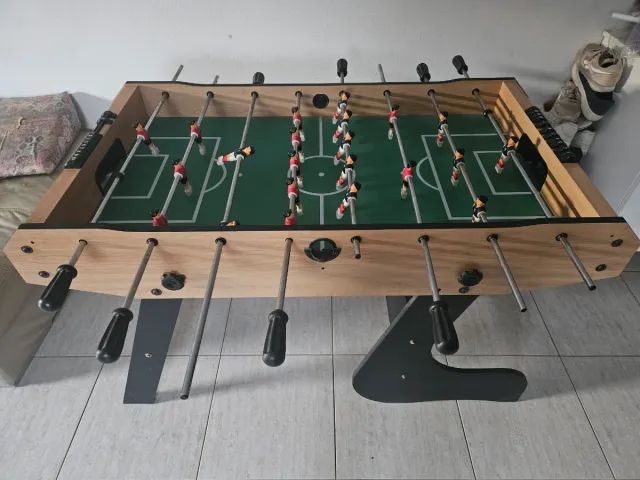 Futbolín en perfecto estado, prácticamente sin uso. - Campo de juego verde con líneas blancas. - Barras con jugadores. - Asas negras para el control.