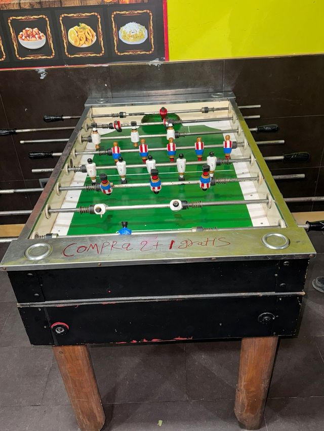 Futbolín de madera en buen estado, listo para horas de diversión. Con signos de uso - Estructura de madera. - Campo de juego verde. - posibilidad de monedero 50 cts