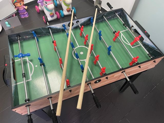 Futbolín de madera con jugadores rojos y azules. - Campo de juego verde. - Barras metálicas. - Dos palos de madera incluidos.