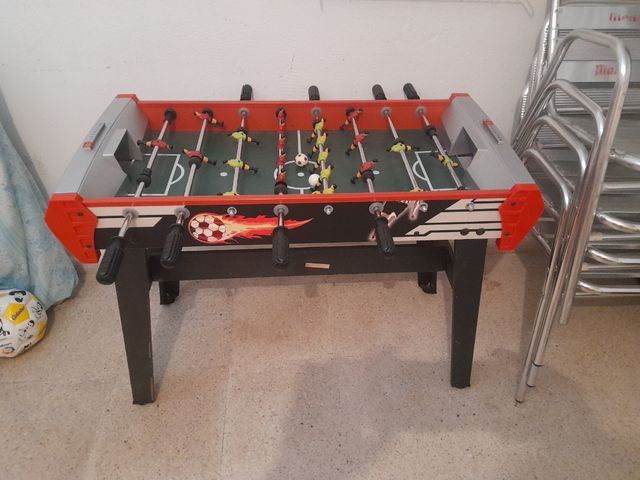 Se vende futbolín de mesa en buen estado. Es un futbolín pequeño y ligero, ideal para jugar en casa. - Medidas compactas. - Diseño rojo y gris. - Incluye todas las piezas.