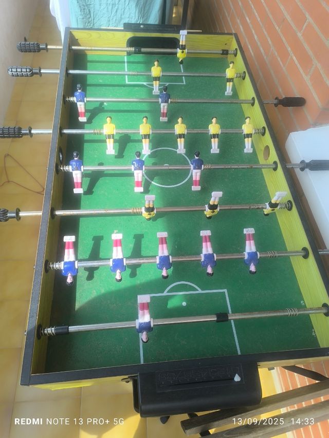 Futbolín de mesa para disfrutar en casa. Ideal para partidas divertidas. - Campo de juego verde. - Figuras de jugadores azules y amarillas. - Barras metálicas con mangos negros.