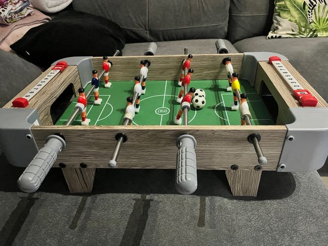 Detalles del productoFutbolín de mesa con diseño de madera y campo de juego verde.