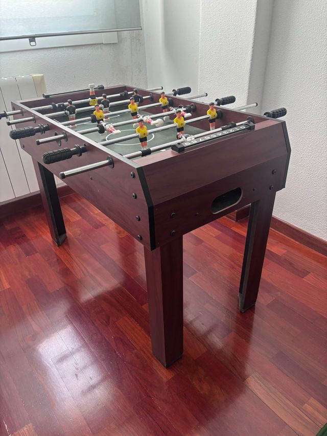 Futbolín de tamaño infantil, perfecto para los más pequeños. - Estructura de madera oscura. - Varillas con jugadores. - Marcadores de puntos.