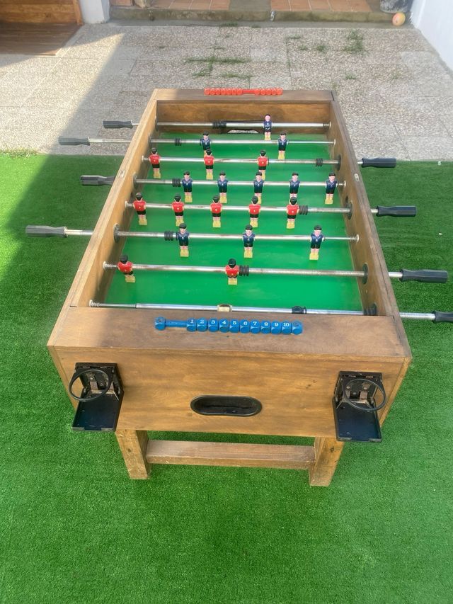 Futbolín de madera maciza, con sus patas niveladoras con cuatro posavasos y niveles en sus laterales.Es bastante pesado para que no se mueva mientras se juega