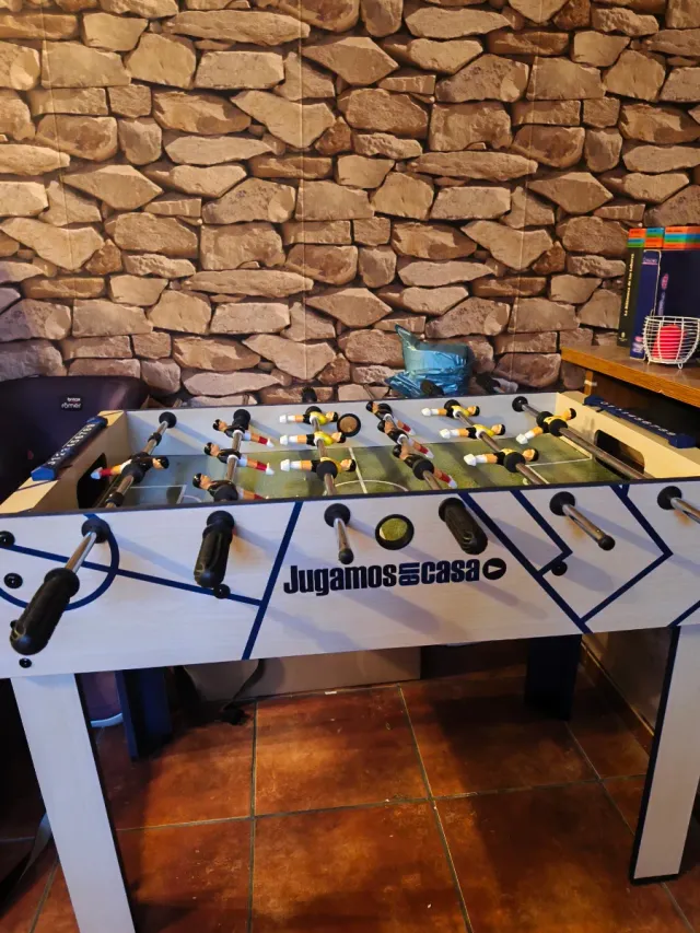 Detalles del productoFutbolín de tamaño reducido, ideal para espacios más pequeños. Presenta un diseño moderno con detalles en azul.