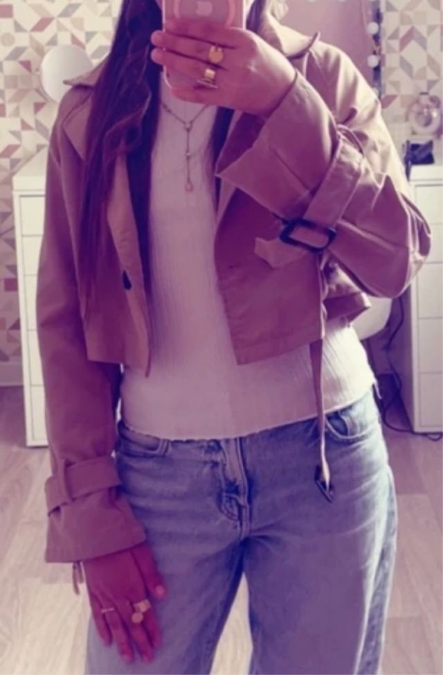 Gabardina corta beige, talla 12 equi. a XXS-XS
