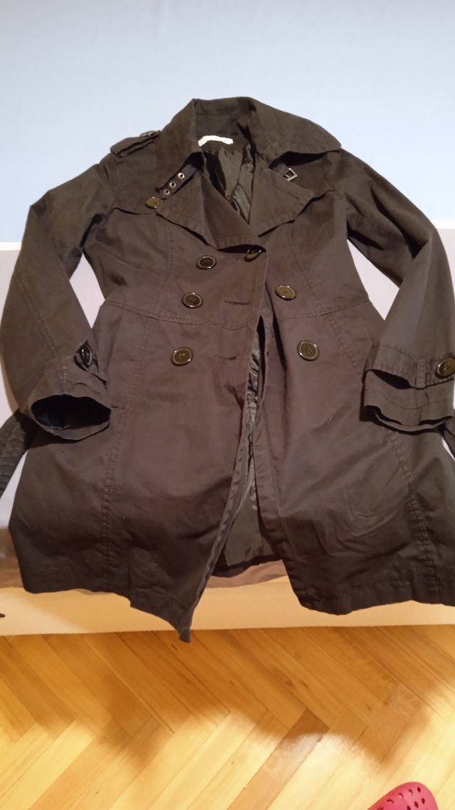 Vendo esta gabardina negra de Caché Caché, es informal, talla xs/s. Tiene forma entallada, detalles con botón en puños y cuello en el cual tiene un cierre también con correa ajustable. También detalle de botón en la espalda, se ajusta con cordón ancho, es larga y de entretiempo de algodón, tiene forro interior. Usada un por no usarla apenas