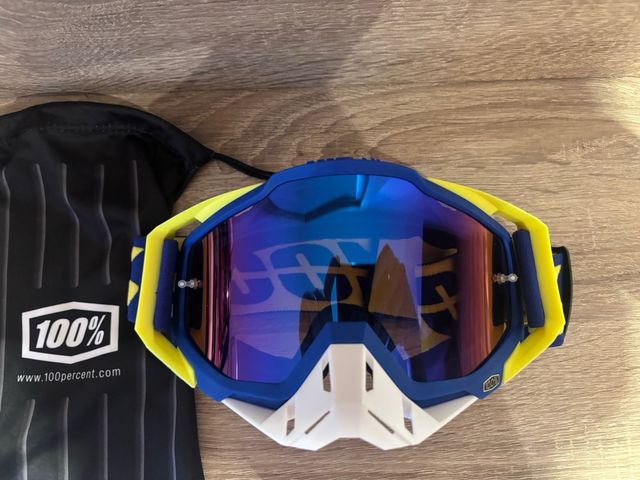 Detalles del productoGafas de motocross 100%, ideales para la práctica de enduro. Son de color azul y amarillo, con lentes de espejo. Se incluyen las gafas y su funda. - Lentes de espejo para una visión óptima. - Diseño deportivo y moderno. - Cómodas y ajustables.