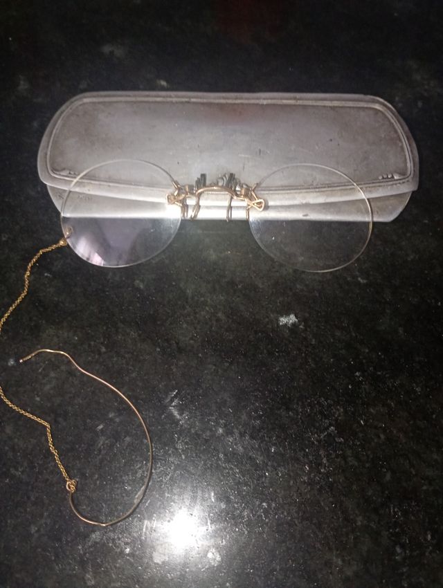 Conjunto de gafas de oro antiguas con su cadena y estuche. - Lentes redondas. - Montura dorada. - Cadena fina. - Estuche metálico.
