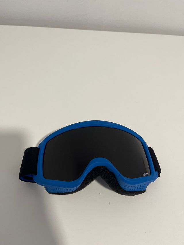 Gafas de esquí con montura azul y lente oscura. - Montura de plástico azul. - Lente con tratamiento antivaho. - Correa ajustable negra.