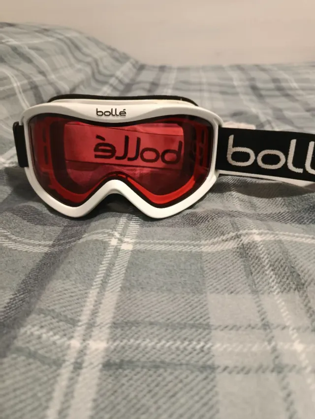 Gafas de esquí de la marca Bollé con lente roja. - Montura blanca. - Correa negra con logo. Con funda.