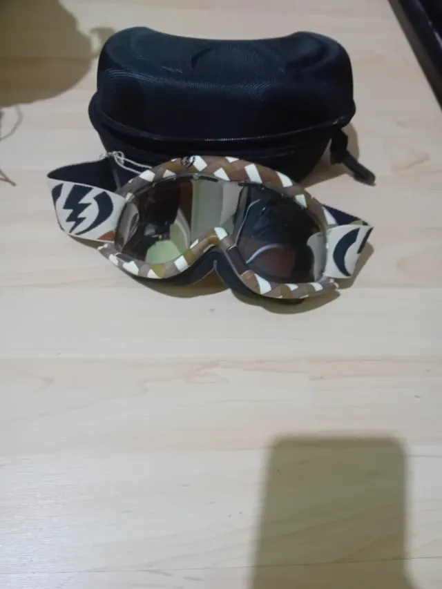 Gafas de esquí con un diseño llamativo y su funda protectora. - Montura con patrón de rombos y rayos. - Lente espejada. - Incluye funda rígida negra.