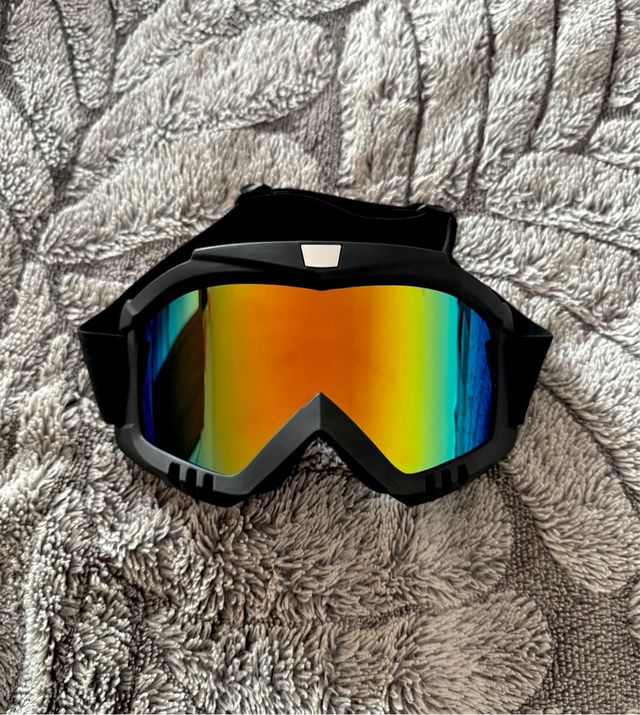 Gafas de esquí con lente de espejo multicolor. Diseñadas para proteger tus ojos en la montaña. - Montura negra. - Correa ajustable. - Lente con efecto espejo.