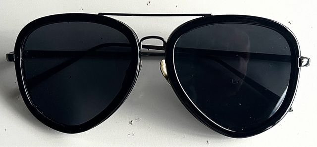 Gafas de sol tipo aviador con los cristales y frontal de la montura en color negro y las patillas metálicas.
