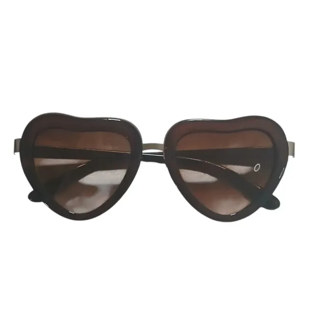 Gafas de sol con un diseño divertido en forma de corazón. El marco es de un tono marrón oscuro y las lentes son degradadas.