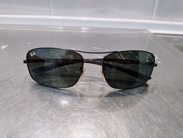 Detalles del productoVendo gafas de sol de Ray-Ban con varillas de fibra de carbono. Modelo 8309, color 002/71 y calibre 59*18. Color de cristal gris oscuro y la montura negra. La gafa está en buen estado aunque haya sido utilizada. Comodísimas, muy ligeras. Los cristales están en inmejorables condiciones, sin un rasguño. Fotos en la galería. También entrego una funda Ray-Ban roja, el certificado de autenticidad y la gamuza. Entrego en mano en la estación de la Renfe de Las Águilas.