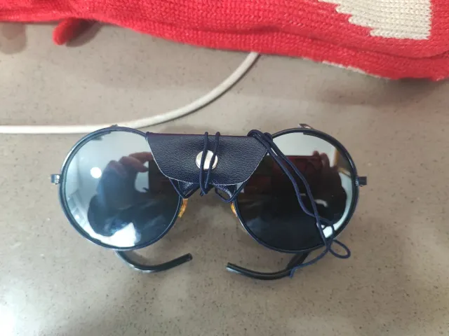 Gafas de ventisca con diseño redondo y protector de cuero. - Lentes oscuras. - Protector de cuero azul marino. - Cuerda de sujeción.