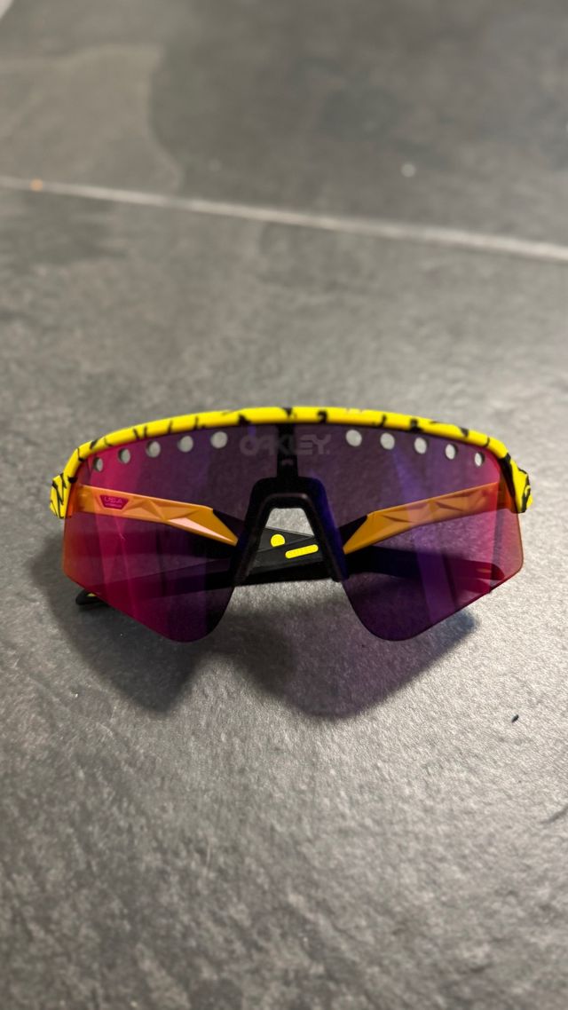 Gafas de sol Oakley con un diseño deportivo y llamativo en color amarillo. - Montura de plástico. - Lentes con acabado espejo. - Diseño ventilado.