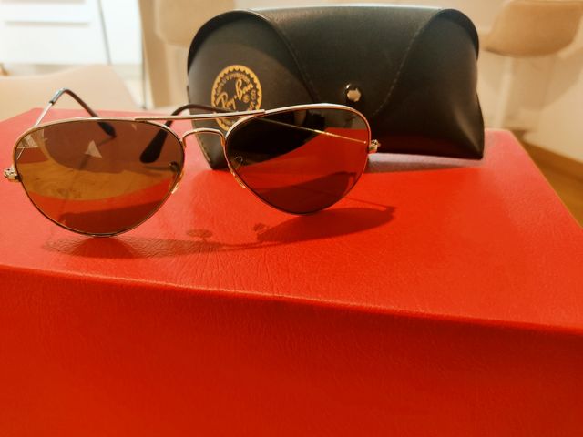 Detalles del productoGafas Ray-Ban aviator efecto espejo. Se venden co. su estuche protector original con pasador de cinturón en el reverso. solo tienen el detalle que se muestra en la foto de leve rasgadura en patilla derecha.