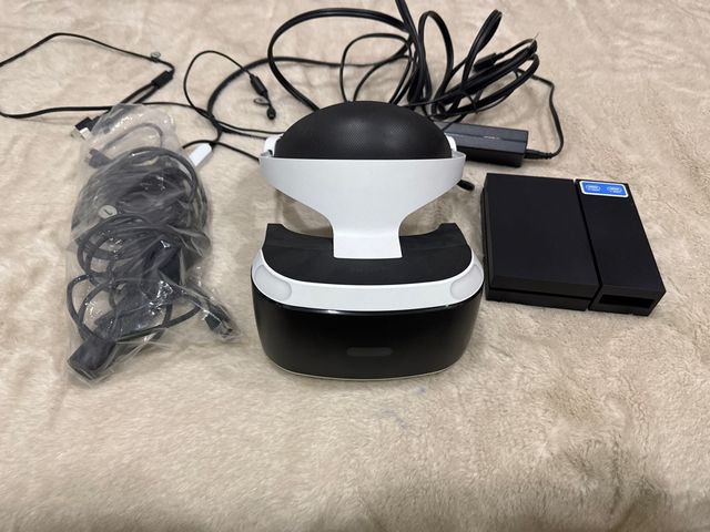 Visor de realidad virtual Sony. - Diseño ergonómico en blanco y negro. - Incluye cables y adaptadores.