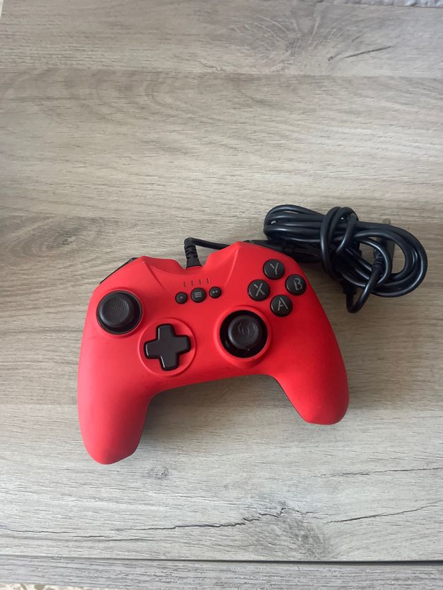 Gamepad Nacon GC-100 en color rojo, diseñado para PC. - Diseño ergonómico para mayor comodidad. - Botones frontales con letras (A, B, X, Y). - Sticks analógicos precisos. - Cruceta direccional.