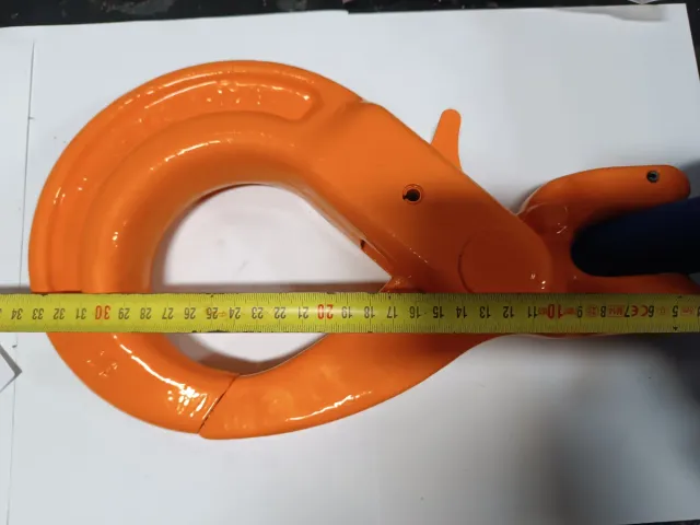Detalles del productoGancho de elevación de seguridad de color naranja brillante. Es una pieza robusta y resistente, ideal para tareas de elevación.