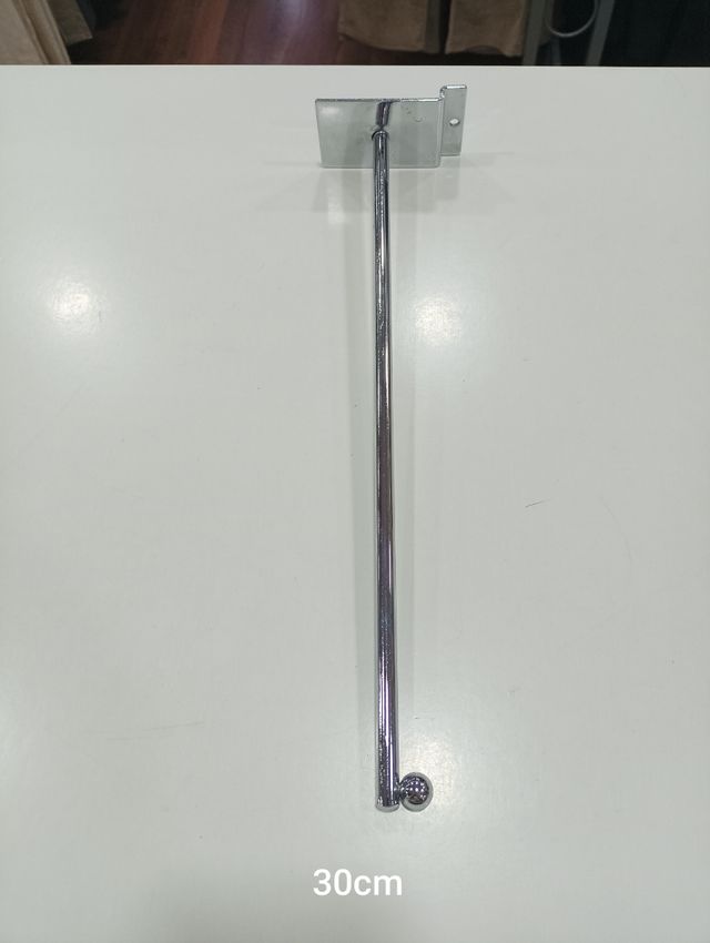Gancho para paneles de lamas madera. Acabado cromado, terminación en bola. Medida 30cm Precio unidad 3€.
