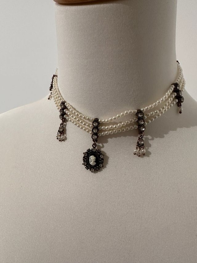 Detalles del productoElegante gargantilla de estilo retro con múltiples hileras de perlas y un detalle central de camafeo.
