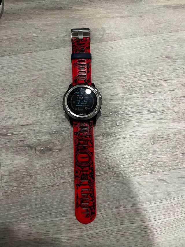 Reloj inteligente Garmin Fenix 3 HR con correa personalizada. - Pantalla circular. - Correa roja con diseño. - Bisel plateado.