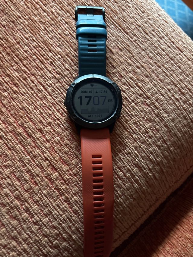 Reloj inteligente Garmin Fenix 6x Pro Solar con correa de color azul y naranja. - Pantalla circular. - Correa de silicona.
