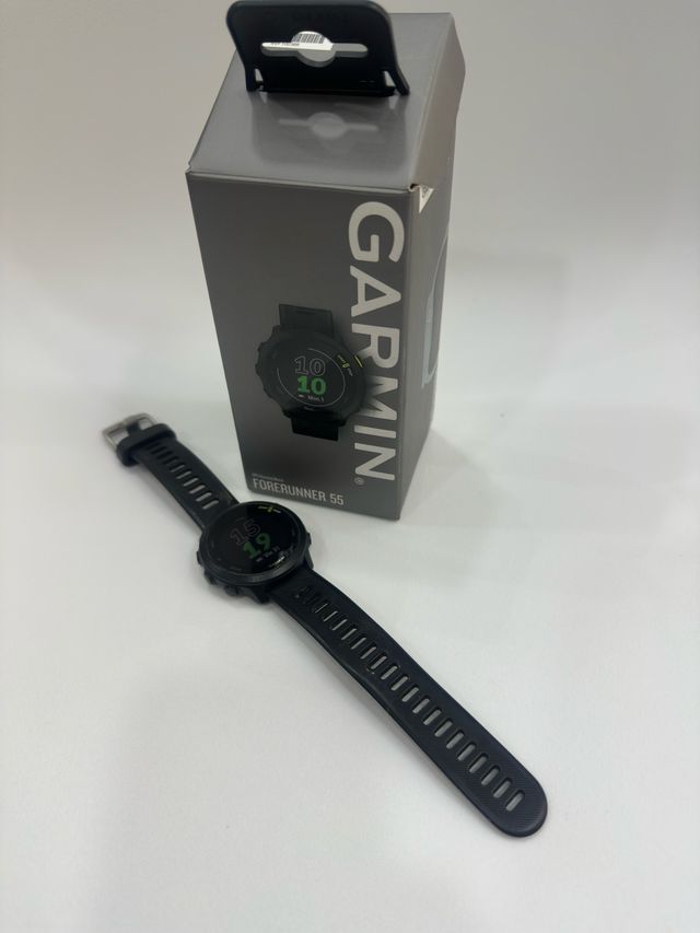 Reloj GPS Garmin Forerunner 55 en color negro. - Diseño deportivo y ligero. - Correa de silicona ajustable. - Pantalla a color. - Caja original incluida.