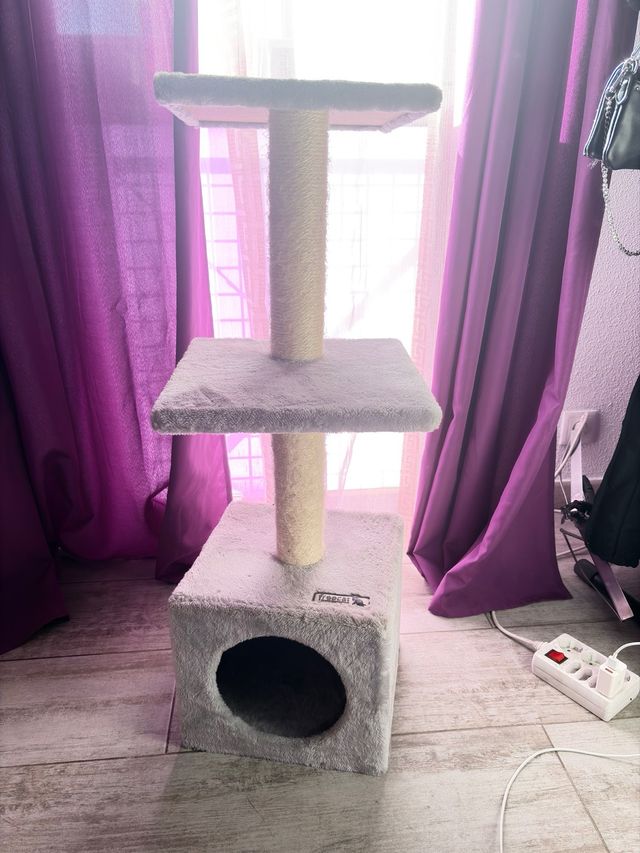 Gatera de tres pisos con una altura de 1.40 metros. Ideal para que los gatos jueguen y descansen. - Base acolchada. - Plataformas cubiertas de felpa. - Poste rascador.