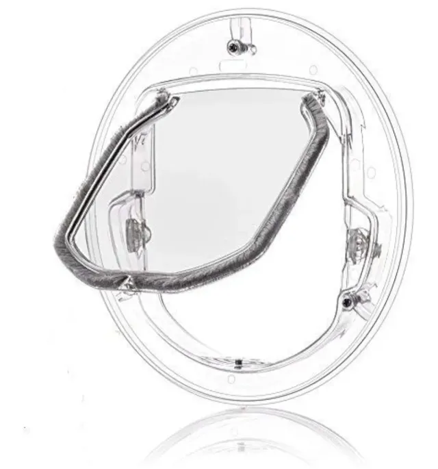 Gatera transparente con cepillo para el aislamiento. - Diseño circular. - Material acrílico. - Bisagra para apertura.