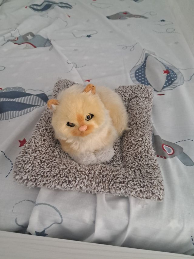 Detalles del productoPrecioso gatito de peluche, ideal para niños. Es de color beige claro y tiene una textura muy suave.