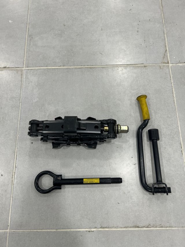 Kit de elevación para coche. - Gato elevador de tijera. - Manivela para el gato. - Perno de remolque.