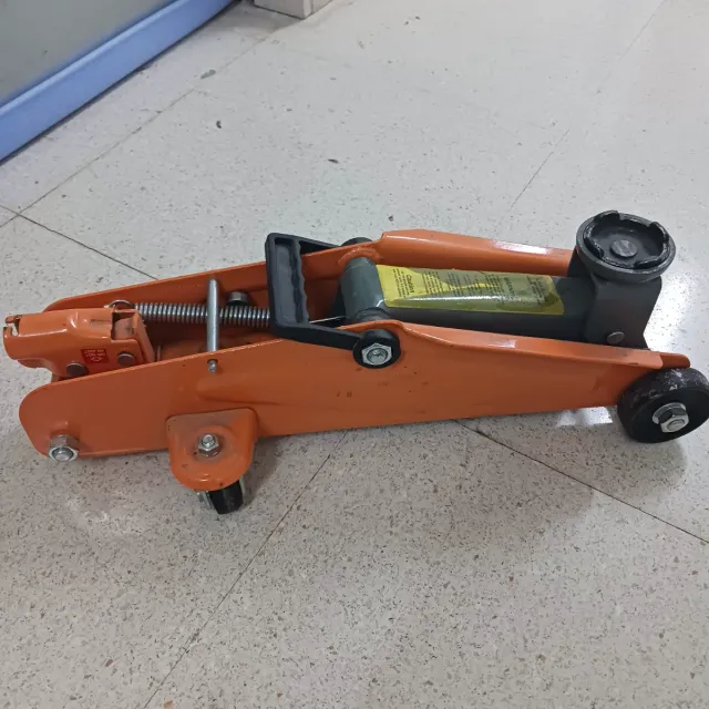 Gato hidráulico de color naranja con capacidad de 2 toneladas. - Construcción robusta. - Ruedas para fácil movilidad.