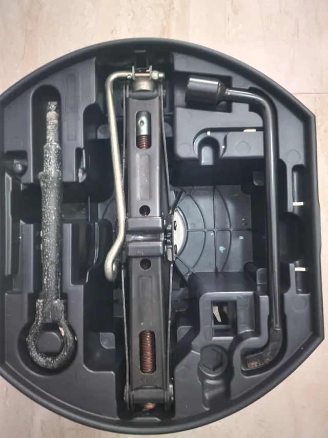 Kit de herramientas para coche, incluye gato hidráulico y llave. - Gato hidráulico de tijera. - Llave de cruz para ruedas. - Gancho de remolque.