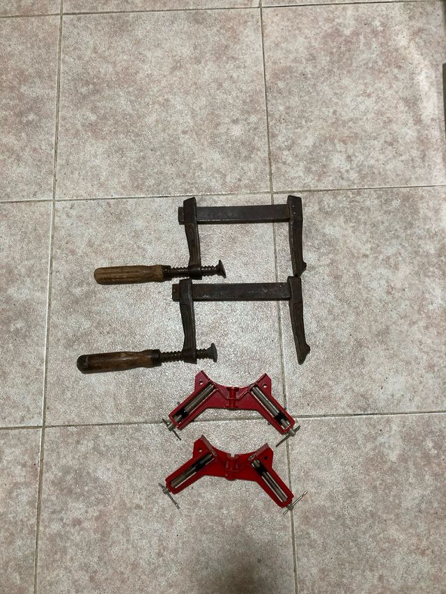 Herramientas de carpintería para sujetar piezas. - Dos gatos de carpintero de metal con mangos de madera. - Dos esquineros de sujeción de color rojo.