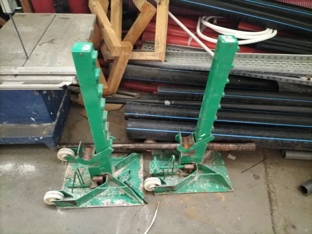 Detalles del productoPar de gatos hidráulicos de color verde, diseñados para soportar bobinas de cables.
