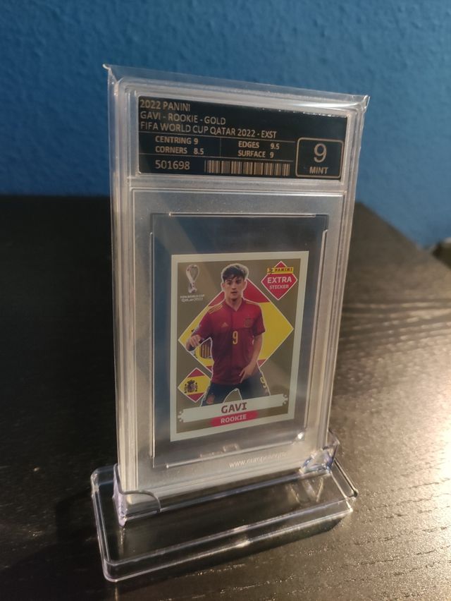 Detalles del productoCromo ultra raro de Gavi Version Extra Sticker Oro, mundial qatar 2022. Gradeado por European Garding con 9 MINT. Sin sacar del precinto.