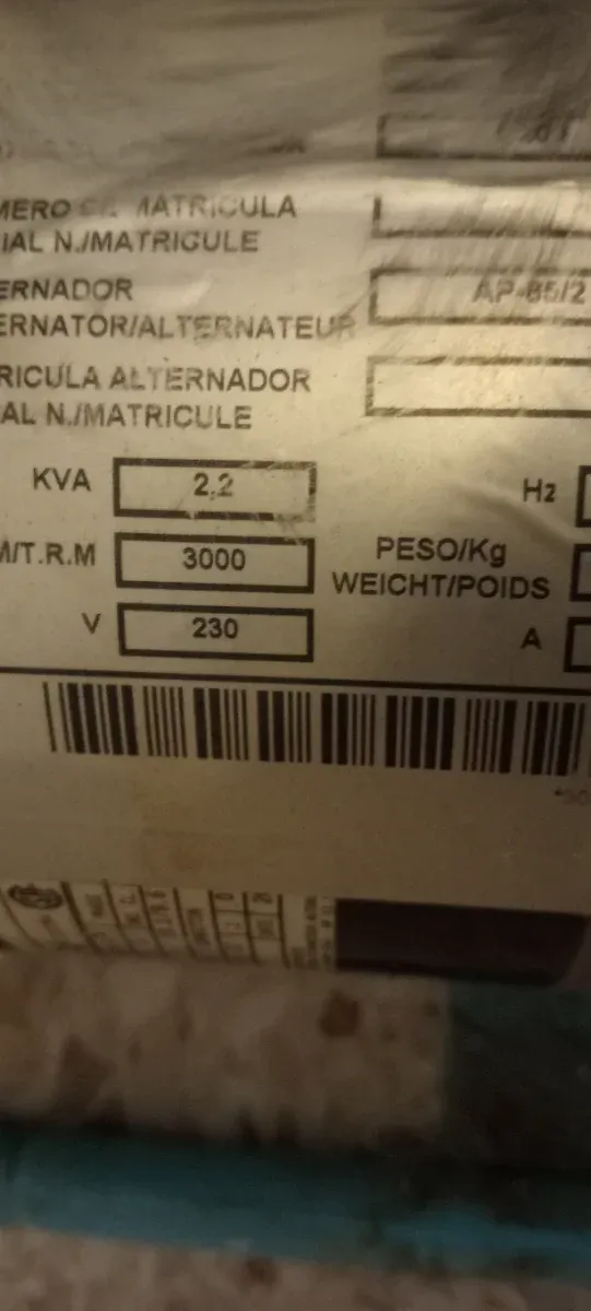 Generador eléctrico con una potencia de 2.2 KVA. - Motor de 3000 RPM. - Voltaje de 230 V. - Modelo AP-85/2.