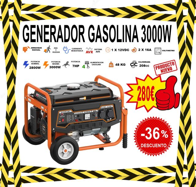 Detalles del productoGenerador gasolina potencia máxima de 2900W y nominal de 2800W. Trabaja con un motor de 4 tiempos con combustible de gasolina. Dispone de una autonomía de funcionamiento de hasta 10 horas y un depósito de 15 Litros de capacidad de combustible y 600 ml de aceite. Arranque manual con lanzador: 7HP. Dispone de 2 tomas monofásicas (230 V) y una toma de 12V. PRODUCTO NUEVO EN SU EMBALAJE ORIGINAL