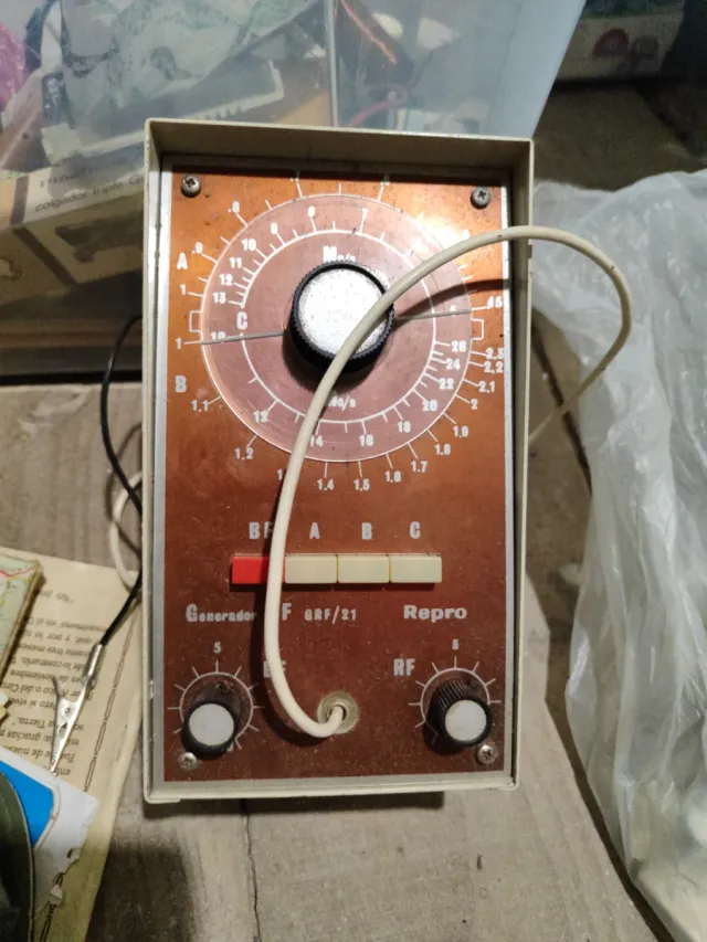 Antiguo generador de radio GRF/21. - Modelo: GRF/21 - Funciones: Generador, RF - Indicadores: A, B, C - Dial circular con escalas.