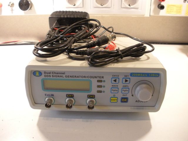 - Botones de control: CH1/2, SET, WAVE, AMPL, PgUp, PgDn, SHIFT, OK, ADJUST.