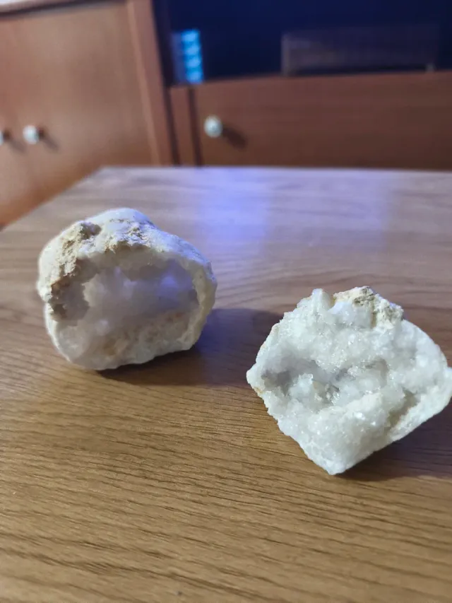 Dos geodas de cristal de roca con interior cristalino. - Una geoda abierta con cavidad interior. - Otra geoda con formación de cristales en la superficie.