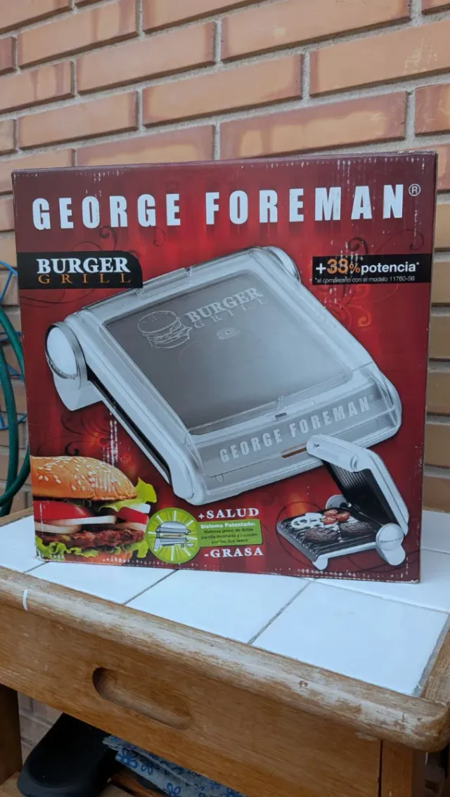Plancha eléctrica George Foreman para hacer hamburguesas. - Diseño compacto y fácil de usar. - Superficie antiadherente. - Sistema patentado para reducir grasa.