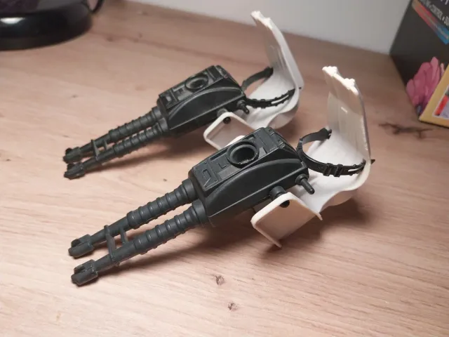 Piezas para el vehículo Gi Joe Rolling Thunder. Incluye dos torretas con sus soportes. - Dos torretas negras. - Dos soportes blancos.