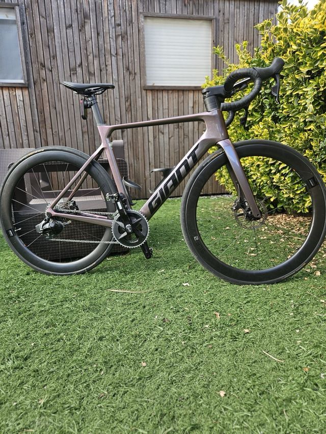 Detalles del productoBicicleta de carretera Giant Propel del año 2023. Diseño aerodinámico y acabado en color púrpura iridiscente.