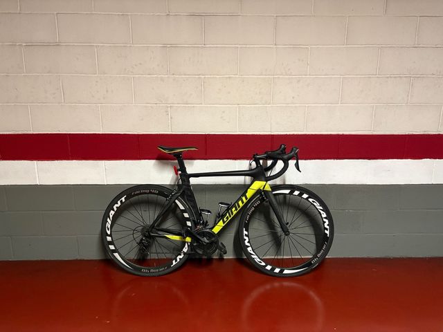 Detalles del productoBicicleta de carretera Giant Propel con un diseño aerodinámico y llamativo en negro y amarillo.